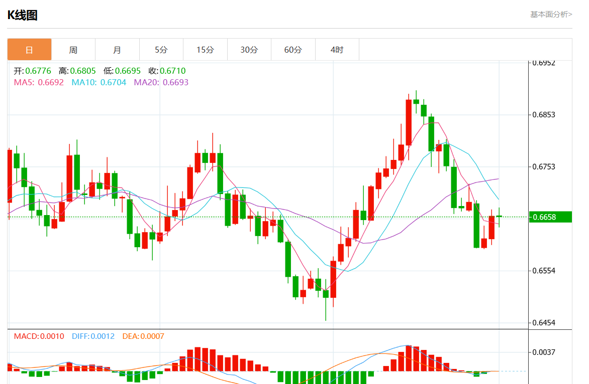 周一盘中,澳元/美元最新报0.6654,日图跌0.08% 今日分析:在0.6635上方建立多头头寸,目标在0.6680和0.6695。 技术点评:0.6635的支撑基础已经形成,并允许暂时稳定。 支撑位:0.67150.66950.6680 阻力位:0.66350.66150.6600