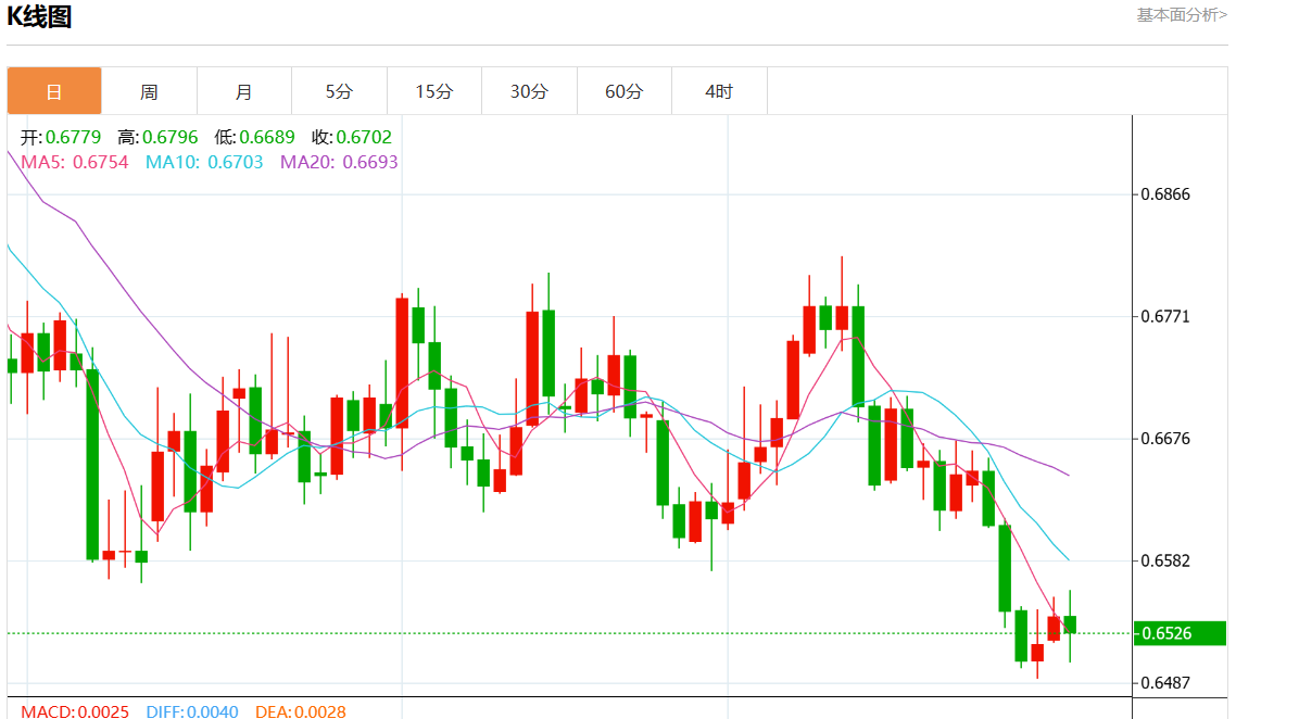 周二盘中,澳元/美元最新报0,6526,日图跌0.18% 今日分析:在0.6545之下,看跌,目标价位为0.6495,然后为0.6475。 技术点评:RI技术指标向下运行。 支撑位:0.65800.65600.6545 阻力位:0.64950.64750.6455