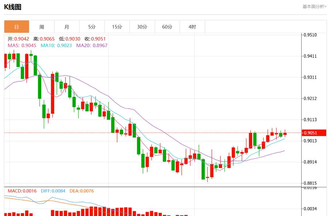周二盘中,美元/瑞郎最新报0.9051,日图涨0.08% 今日分析:在0.9030之上,看涨,目标价位为0.9075,然后为0.9085。 技术点评:RI技术指标向上运行。 支撑位:0.91000.90850.9075 阻力位:0.90300.90200.9005