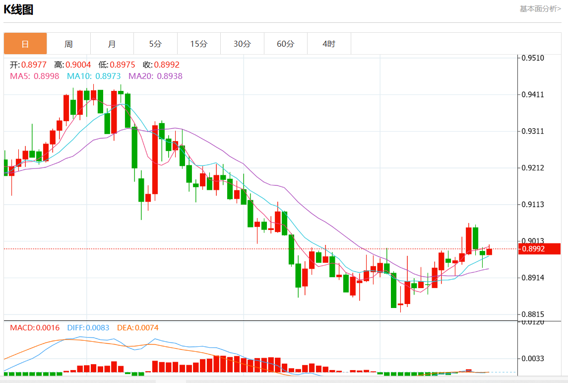 周二盘中,美元/瑞郎最新报0.9000,日图涨0.26% 今日分析:在0.8970之上,看涨,目标价位为0.9000,然后为0.9015。 技术点评:RI技术指标向上运行。 支撑位:0.90300.90150.9000 阻力位:0.89700.89550.8940