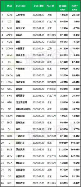 截止至2020年10月1日,共有26家中国企业在美国IO上市(不考虑AC、OTC上市),共募资82.37亿美元。其中5家在美国纽交所上市,21家在纳斯达克上市。 *为10月5日收盘市值,另外募资额不考虑行使“绿鞋” 从募资金额来看 这IO上市的26家,共募资82.37亿(美元,下同),平均每家募资3.17亿。 1、