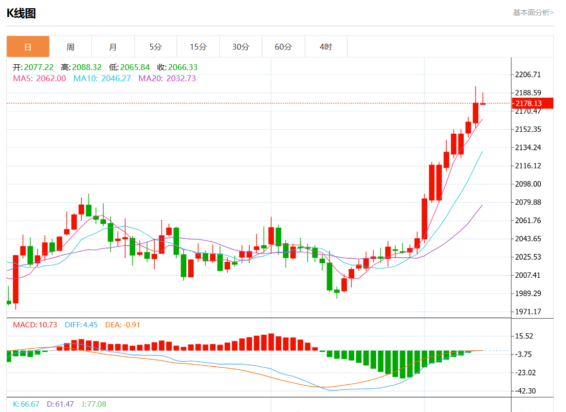 盘面概述: A股三大指数今天集体走强,创业板指表现尤为抢眼。截止收盘,沪指涨0.74%,收报3068.46点;深证成指涨2.27%,收报9581.53点;创业板指涨4.60%,收报1890.41点。沪深两市成交额达到一万亿元,北向资金今日净买入102.61亿元。行业板块几乎全线上涨,新能源赛道突然爆发,电池、能源金属、光伏
