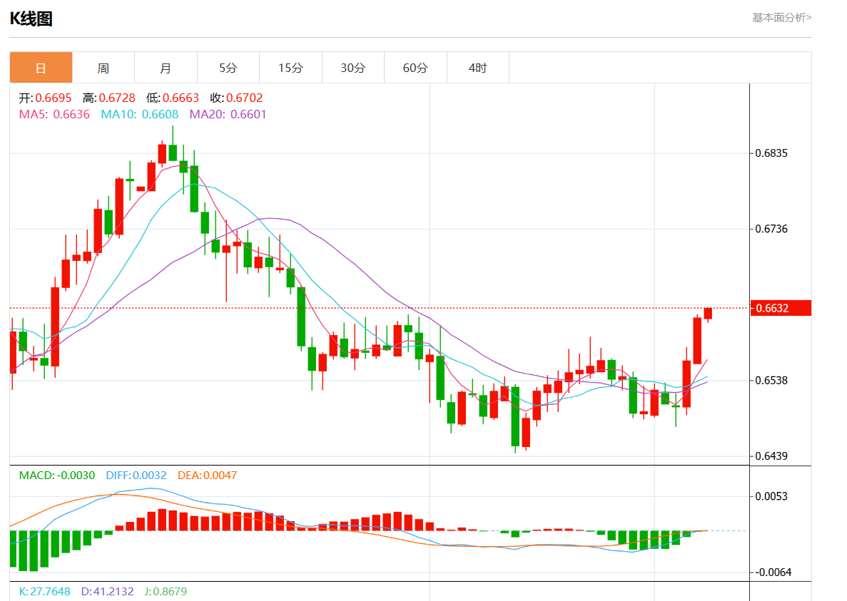 周五盘中,澳元/美元报0.6631,涨幅0.17%。 今日分析:在0.6600之上,看涨,目标价位为0.6640,然后为0.6655。 技术点评:在0.6600之上,为多头信号,向上的目标位为0.6640。 支撑位:0.66700.66550.6640 阻力位:0.66000.65750.6560 (亚汇网编辑