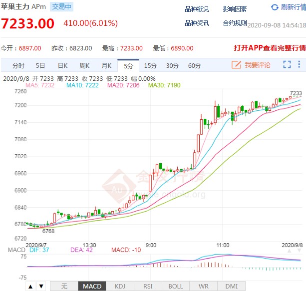 9月8日消息,苹果期货主力合约尾盘涨停,涨幅6.01%,报7233元。 因库存过高消费萎靡,5月后苹果期货合约进入了单边下行通道。05和07合约创下6300元/吨左右的历史新低交割价,2010合约从9400一路跌至7000元/吨之下。近日随着苹果库存消化逐步进入尾声,现货价格有所企稳,苹果跌幅亦有所放缓。 当