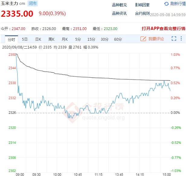 近期政策性粮源持续投放,局部区域新粮陆续上市,进口谷物集中到货,玉米现货市场供应趋于阶段性宽松,现货价格整体平稳,局部仍有下调。不过进入9月以来台风频繁北上造访东北产区,玉米大面积出现倒伏,引发了市场对新作产量的担忧,受此影响,昨日玉米期货主力合约自开盘就出现大幅上涨走势,收盘价2347元,涨56元