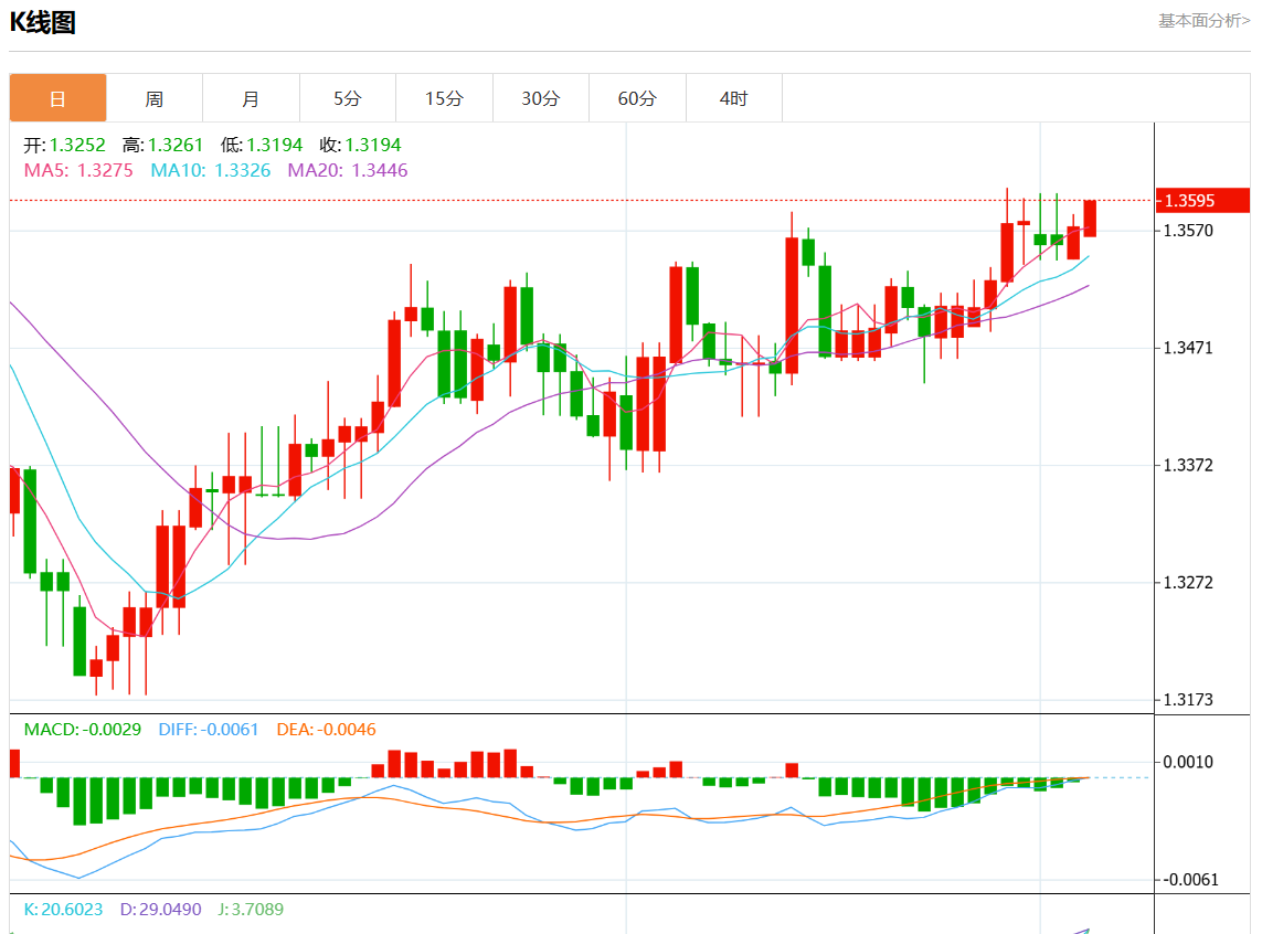周二盘中,美元/加元报1.3592,涨幅0.18%。 今日分析:在1.3560之上,看涨,目标价位为1.3600,然后为1.3620。 技术点评:RI技术指标向上运行。 支撑位:1.36351.36201.3600 阻力位:1.35601.35451.3530 (亚汇网编辑:静香)