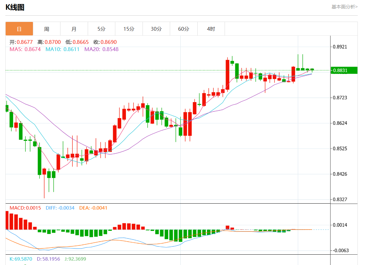 周一盘中,美元/瑞元报0.8831,涨幅0.01%。 今日分析:在0.8850之下,看跌,目标价位为0.8815,然后为0.8800。 技术点评:RI技术指标向下运行。 支撑位:0.88900.88700.8850 阻力位:0.88150.88000.8780 (亚汇网编辑:静香)