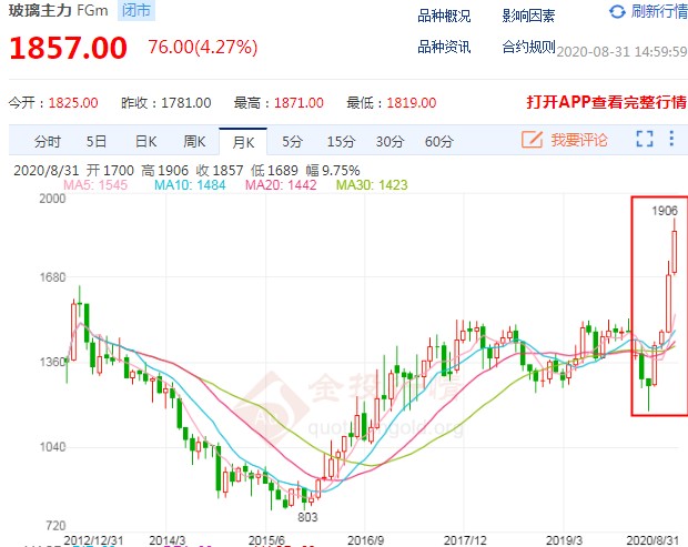 8月31日,玻璃期货主力合约盘中一度触及涨停价1871元/吨,截至收盘,玻璃主力合约报1857元/吨,涨幅4.27%。从近几年来浮法玻璃价格走势图中可以看到,2020年玻璃期货价格走势可谓罕见,疫情利空下,价格直线下降,5月份超跌反弹,8月份玻璃价格呈现直线拉升。 截至8月20日,全国均价已经突破2019年的前