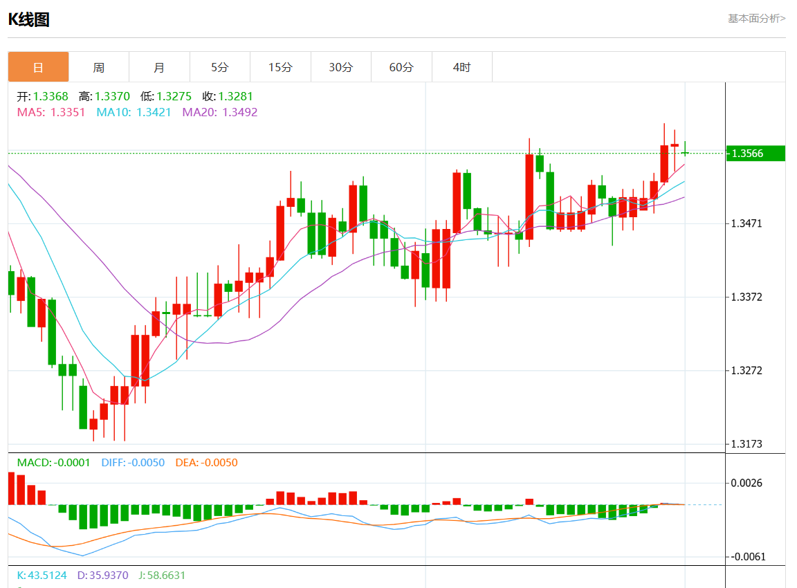周五盘中,美元/加元报1.3570,跌幅0.06%。 今日分析:在1.3555之上,看涨,目标价位为1.3585,然后为1.3605。 技术点评:RI技术指标运行趋势复杂,倾向于上涨。 支撑位:1.36201.36051.3585 阻力位:1.35551.35401.3525 (亚汇网编辑:静香)