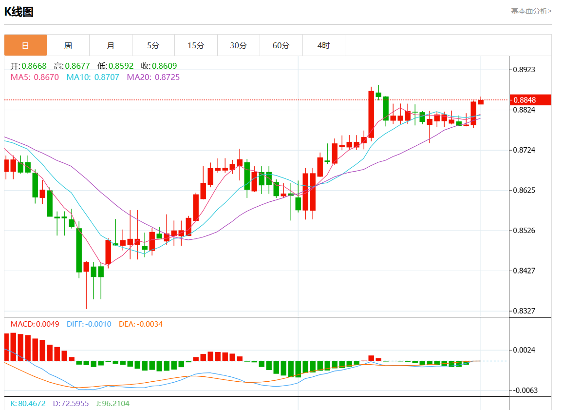 周五盘中,美元/瑞元报0.8853,涨幅0.10%。 今日分析:在0.8825之上,看涨,目标价位为0.8870,然后为0.8885。 技术点评:RI技术指标向上运行。 支撑位:0.89050.88850.8870 阻力位:0.88250.88100.8790 (亚汇网编辑:静香)