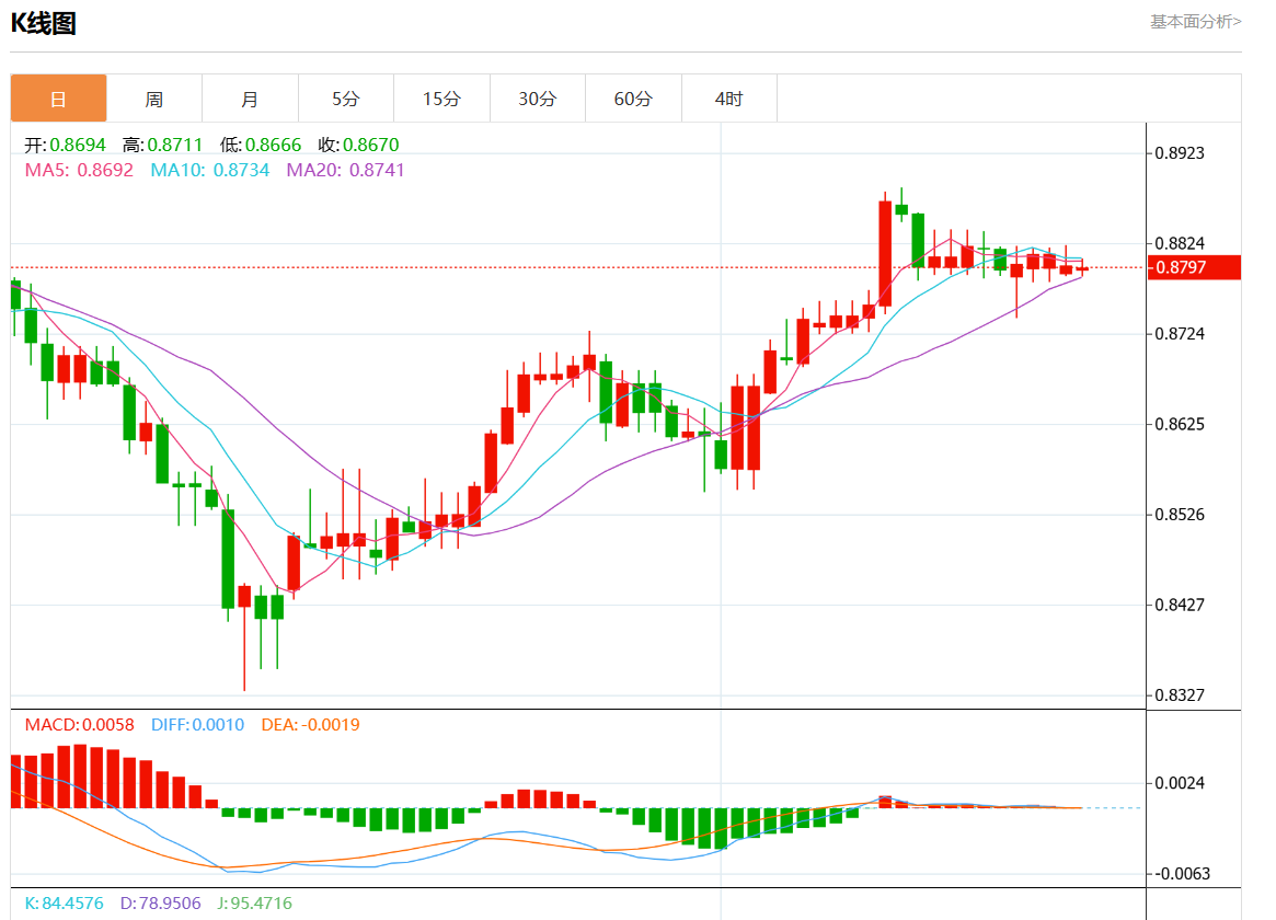 周二盘中,美元/瑞元报0.8796,跌幅0.03%。 今日分析:在0.8820下方做空,目标在0.8780和0.8765。 技术点评:RI缺乏上升动力。 支撑位:0.88500.88350.8820 阻力位:0.87800.87650.8750 (亚汇网编辑:静香)