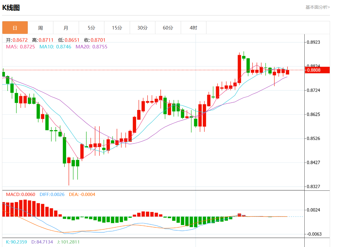 周一盘中,美元/瑞元报0.8807,跌幅0.06%。 今日分析:在0.8800上方做多,目标在0.8835和0.8850。 技术点评:0.8800的支撑位已经形成,并允许暂时企稳。 支撑位:0.88650.88500.8835 阻力位:0.88000.87800.8765 (亚汇网编辑:静香)