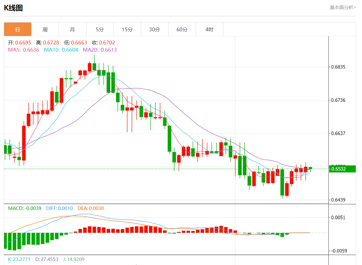 周二盘中,澳元/美元报1.3503,涨幅0.12%。 今日分析:在0.6545下方做空,目标在0.6515和0.6500。 技术点评:RI涨跌互现。 支撑位:0.65750.65600.6545 阻力位:0.65150.65000.6480 (亚汇网编辑:静香)