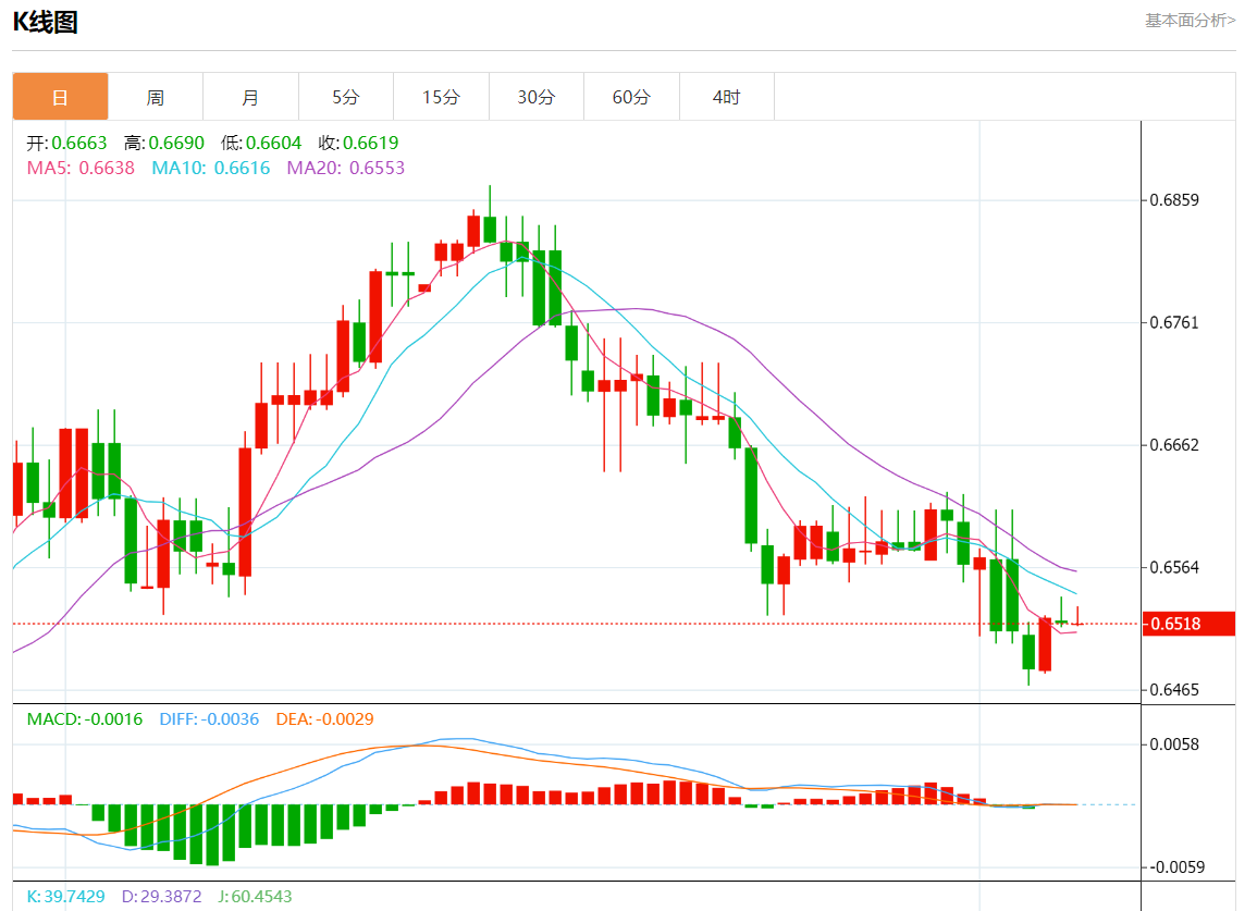 周四盘中,澳元/美元报0.6517,跌幅0.04%。 今日分析:在0.6510上方做多,目标在0.6540和0.6555。 技术点评:0.6510的支撑位已经形成,并允许暂时企稳。 支撑位:0.65700.65550.6540 阻力位:0.65100.64950.6480 (亚汇网编辑:静香)
