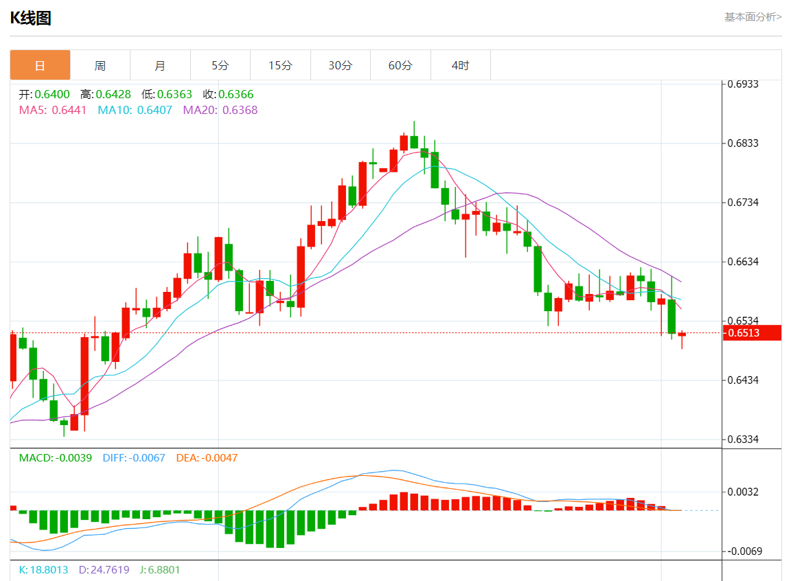周一盘中,澳元/美元报0.6515,涨幅0.03%。 今日分析:在0.6525下方做空,目标在0.6480和0.6450。 技术点评:只要没有突破0.6525的阻力位,跌破0.6480的风险仍然很高。 支撑位:0.65850.65550.6525 阻力位:0.64800.64500.6430 (亚汇网编辑:静香