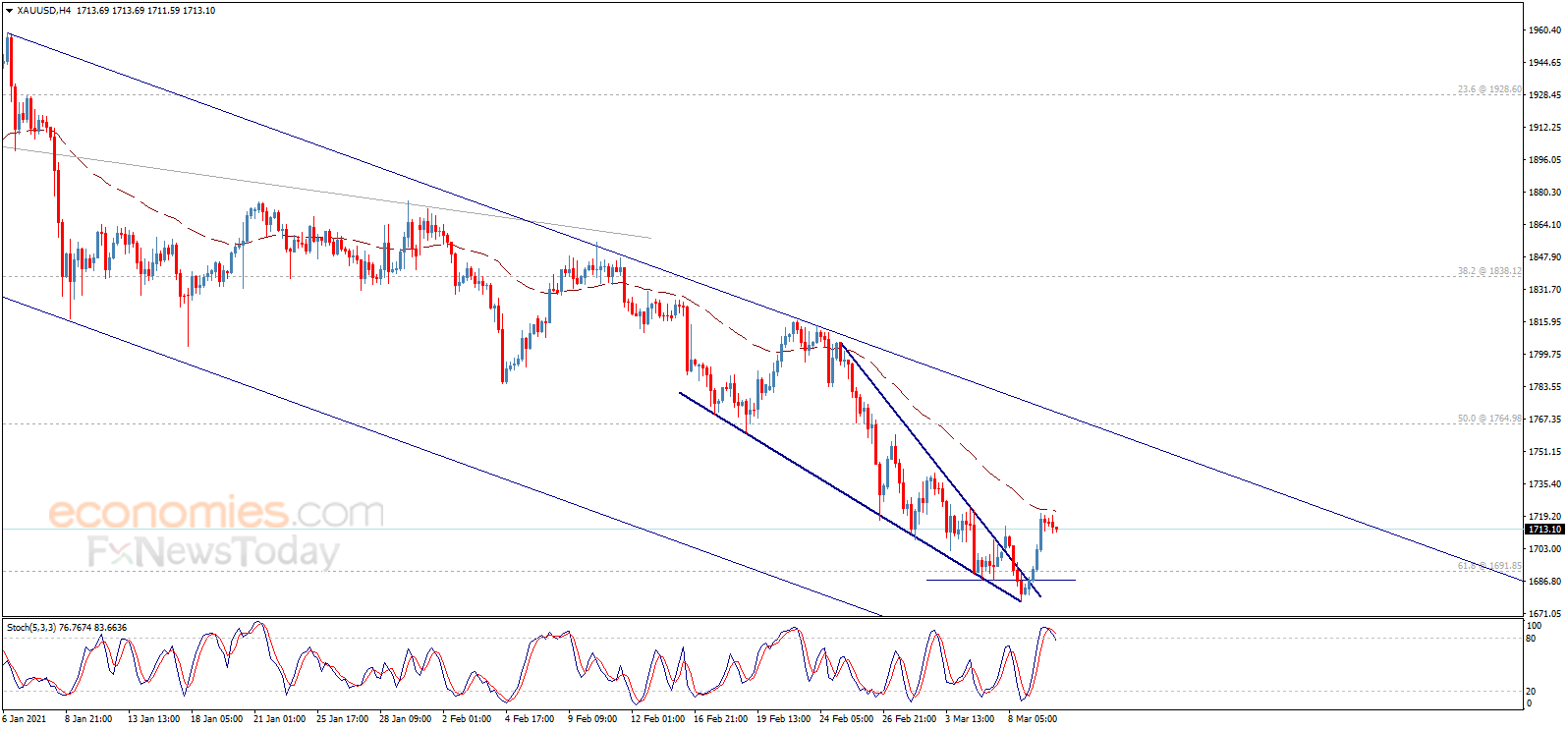 周三(3月10日)亚市尾盘,现货黄金小幅下滑,目前位于1713美元/盎司附近;周二金价曾大涨逾30美元。知名财经资讯网站cooi.co周三最新撰文,对日内黄金走势进行前瞻分析。 cooi.co在文章中写道,金价一度触及首个等待的看涨目标1715.00美元/盎司。但值得注意的是,金价开始传递负面信号,这暗示金价将重回