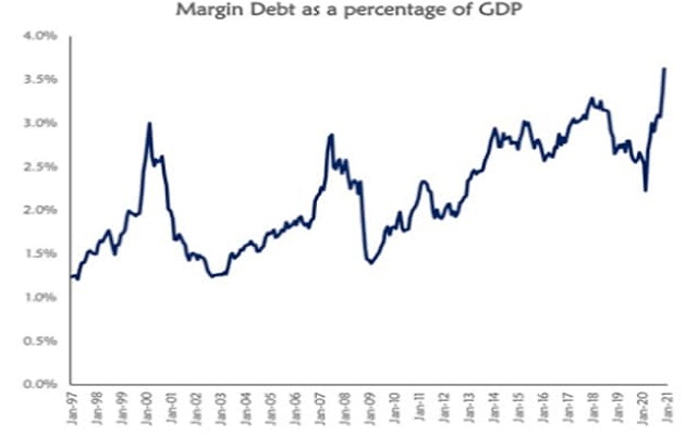 2月23日(周二),市场分析师trJ.Taou撰文称,美联储有一个简单的工具可以用来抑制美股市场过度投机,那就是调整保证金比例。 随着美股飙升至前所未有的新高度,许多显示市场兴奋情绪的指标正在释放警告信号。在金融工具箱中,有许多工具可以评估股市的兴奋程度,而下面这个工具最令人恐惧,那就是保证金债务占GD