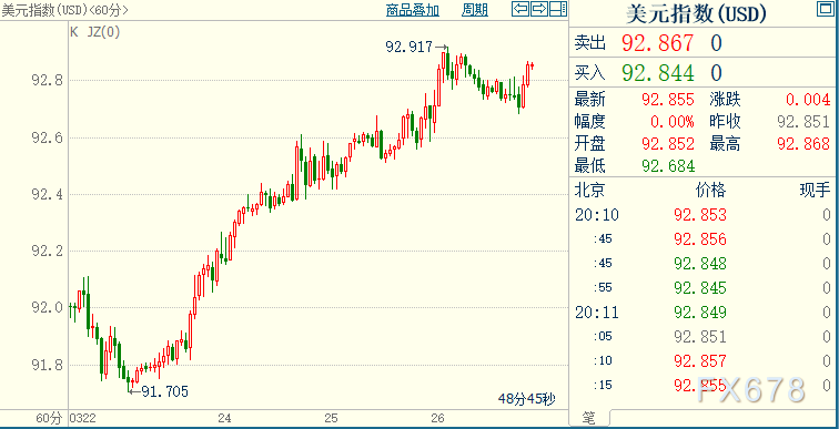 周五(3月26日),现货黄金继续承压,因美元指数在欧洲时段反弹,回补日内多数跌势,美国经济数据改善和新冠疫苗施打带动一波乐观情绪,且美国公债收益率上升。 北京时间20:10,现货黄金下跌0.08%至1725.56美元/盎司;COX期金主力合约下跌0.10%至1725.6美元/盎司;美元指数下跌0.03%至92.850。美债收益率上浮逾