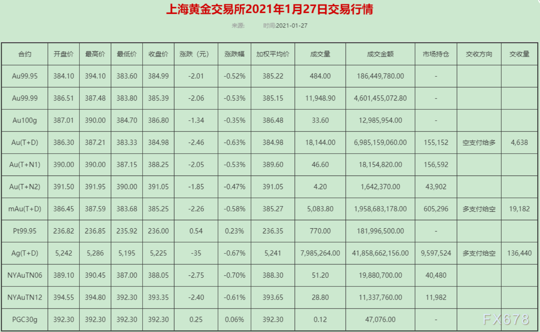 周三(1月27日)上海黄金交易所黄金T+D收盘下跌0.63%至384.98元/克;白银T+D收盘下跌0.67%至5225元/千克。金价收跌,主要因为近期美股的强劲表现利好风险偏好,此外IF上调了2021年的经济增长预期,这对金价不利。 上海黄金交易所2021年1月27日交易行情,黄金T+D成交量18.144吨; 黄金T+D收盘下跌0.63%至38