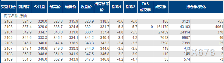 周一(1月25日)上海原油价格下跌,主力合约2103终盘收于332.1元/桶,跌5.3元/桶,跌幅1.57%;盘中一度暴跌近3.8%至一周低位324.6元/桶。因全球疫情持续恶化及美国IA原油库存大增。法国24日进一步加强入境防疫管控。法国官方应对疫情的科学委员会主席德尔弗拉西24日晚表示,法国可能有必要采取新一轮“封城”措施,