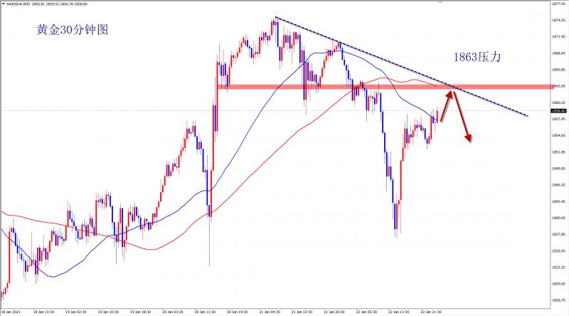 黄金今日整体波动幅度有限,早盘最高触及1860一线后弱势回落,我们1856现价果断干空,弱势震荡,我们空单1850减仓了,欧盘继续关注1863压力,除非行情强势拉升,否则此位置下黄金还是看跌不变! 关键性的压力支撑,承载行情转折的分水岭,行情强弱的判断依据!虽然黄金周五强势深V,但是最终还是在此前1860-187