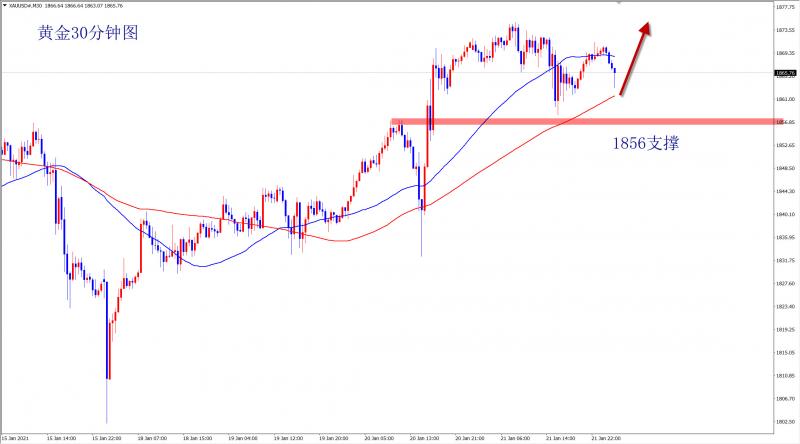 昨日周四,黄金在前一个交易日洗盘探底回升之后,日内整体呈现强势整理走势,突破1863阻力后如期续涨,最高涨至1875一线有所承压,回测1858一线企稳震荡整理。 昨日强调黄金依托1856支撑在接近1863附近布局多单看涨,最高涨至1875一线,美盘止跌1858位置后提示1861多单直接入场,继续依托1856支撑看涨,最高涨