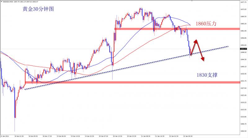 黄金今日弱势下行,最终破位1860支撑重回此前的盘整区域内,我们1853空单顺势跟进,如期跌至1845目标位置,美盘反弹还是继续空!依托1860压力干空! 黄金遇阻1875压力位置后回调,二次上攻还是未能新高,今日弱势下跌,最终破位下行,直接跌至1845位置,重回此前的盘整震荡内部,上涨反弹夭折,接下来黄金将会