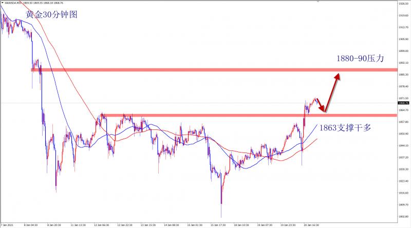黄金今日的走势相较于昨日来说,略显平静,但是依然站稳在1863盘整支撑上方,还是维持看涨思路不变,早盘1868多如期中上涨,欧盘回落再次干多了,当前行情整体变动不大,继续持多看涨! 黄金昨日剧烈震荡,最终选择向上突破,今日整天维持在1863上运行,虽然没有继续大幅拉升,但多头依然非常强势,震荡是为了