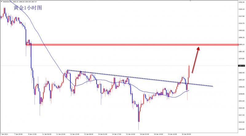 黄金今日空头虚晃一枪,最后在1830位置获得支撑后深V大涨,并且突破1863压力,正式开启波段上涨,方向已经确立,我们1859果断跟进多单,如期涨至1867一线!接下来还是多! 今日美国总统正式交接,黄金大起大落洗盘,最终黄金选择向上突破,当前行情已经脱离底部盘整区域,方向明确,上涨只是时间问题!交易中总
