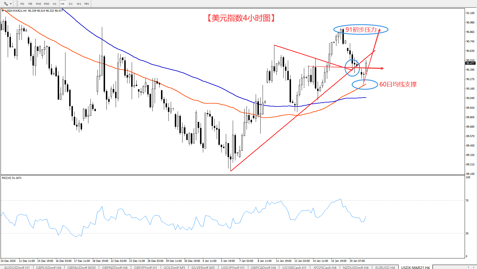 1月20日15:00至22:30周三(1月20日)欧市尾盘,美元指数有所回落,最低触及90.48,此前一度持续上涨,最高触及90.61;现货黄金走出“V”型行情,跌至1832.30美元/盎司后大举反弹,回升至1850美元关口上方后持续走高,目前已经触及1860美元关口。 欧洲时段市场总体倾向于平静,但外汇交易中有一些显著的动作值得
