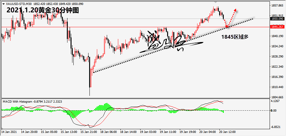 黄金 美国提名财长耶伦的讲话继续再市场发酵,支持黄金在白盘震荡走高。晚盘重点关注加拿大央行利率决议,以及拜登在就职典礼上的讲话。 黄金白盘震荡走高,金价在1857位置承压后开始震荡回落。黄金的当前整体走势来看,日K线出现连阳,说明整体走势比较强。从结构来看,金价今早突破1845周二的高