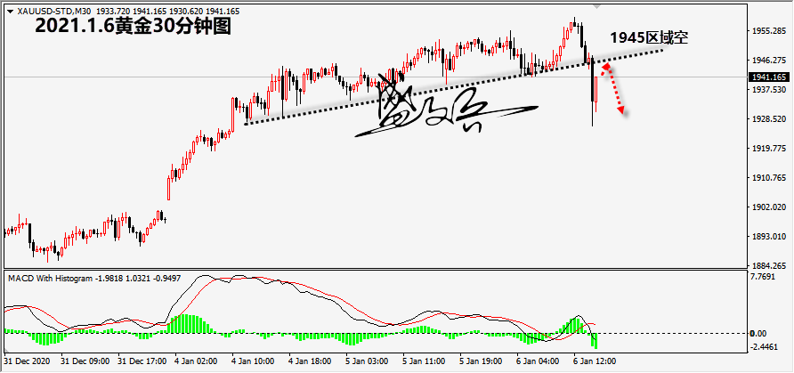 周三(1月6日)欧市盘中,现货黄金短线暴跌,连续下破1940、1930关口,日内最多狂泄近30美元;美元短线拉升至89.30附近…… 有数据显示,COX最活跃黄金期货合约在北京时间1月6日20:43-20:44两分钟内买卖盘面瞬间成交8153手,交易合约总价值逾15.7亿美元。 技术面来看,在确认突破8月以来的下行趋势线后,