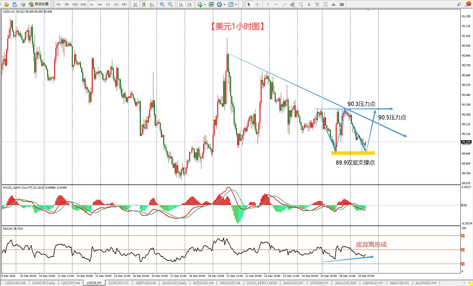 今天的外汇市场相比前几个交易日,还算是比较平静,虽然美元有一定的回落,但是明显走势并没有那么弱,虽然今天没什么数据,但是行情走的还算是比较标准。 从美元的1小时结构来看,美元于今日回撤至89.9之后,形成双底形态,并且自步入欧盘,小时线连续收出三四根倒垂线,并且ri指标背离形成,acd的空头动能