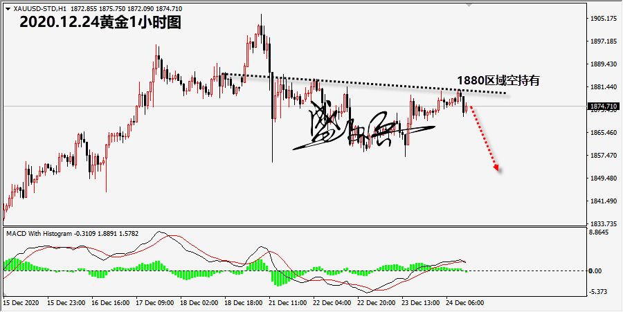黄金 英国政府就脱欧贸易谈判未召开新闻发布会。据悉英国议会将于12月30日批准脱欧协议。晚盘重点关注美国众议院对修改后的刺激方案计划的表决。 黄金完全符合笔者的预期,黄金欧盘反弹至1880.6位置承压回落10美元。完全符合笔者的预期。只要根据笔者今日策略在1880区域参与空头者,成功获利10美元。