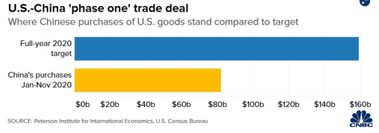 智库彼得森国际经济研究所(troItitutforItratioalcooic)汇编的数据显示,中国仍远未实现其在“第一阶段”贸易协议中承诺购买的美国商品。 II引用美国最新的贸易数据说,今年1月至11月,中国购买了820亿美元的美国商品——刚刚超过2020年全年1590亿美元目标的一半。数据显示,中国在购买美国