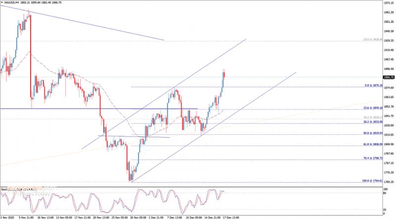 国际现货黄金周四(12月17日)强势走高,最高触及1896.14美元/盎司后小幅回撤,目前停留在1890关口附近,多空双方围绕这一关口开始了新一轮的争夺。黄金迎来强劲的买盘支撑,主要是受到美元大跌的影响,目前美元指数已经跌破90大关,跌至多年来新低。分析师认为,美国新一轮财政刺激前景越来越好,同时美联储进一步