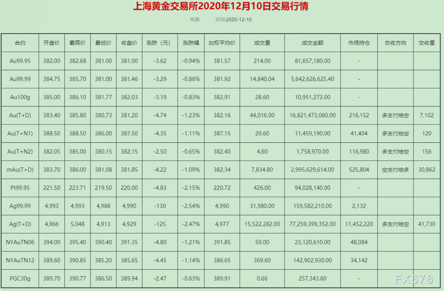 周四(12月10日)上海黄金交易所黄金T+D收盘下跌1.23%至381.2元/克;白银T+D收盘下跌2.47%至4929元/千克。金价收跌,主要因为美国财政刺激谈判仍然艰难,此外,不断恶化的美国疫情形势增加了美元的避险需求,不利于金价。 从长期来看,比特币的避险需求可能会给黄金需求带来一些打压,但疫情结束后,全球再通胀预