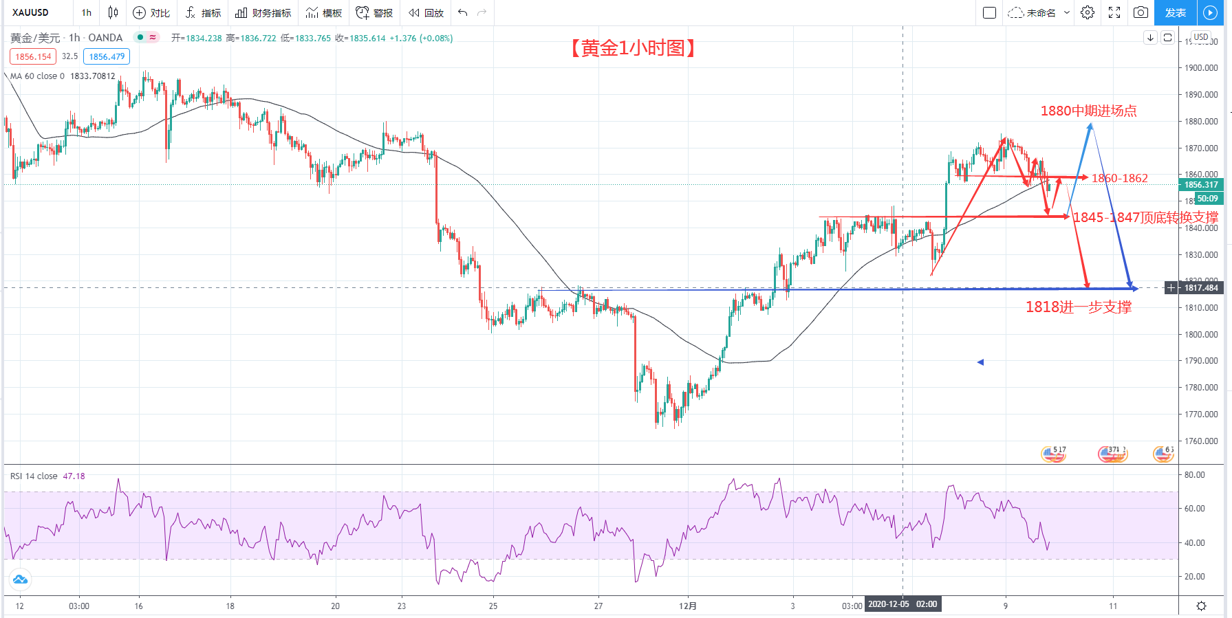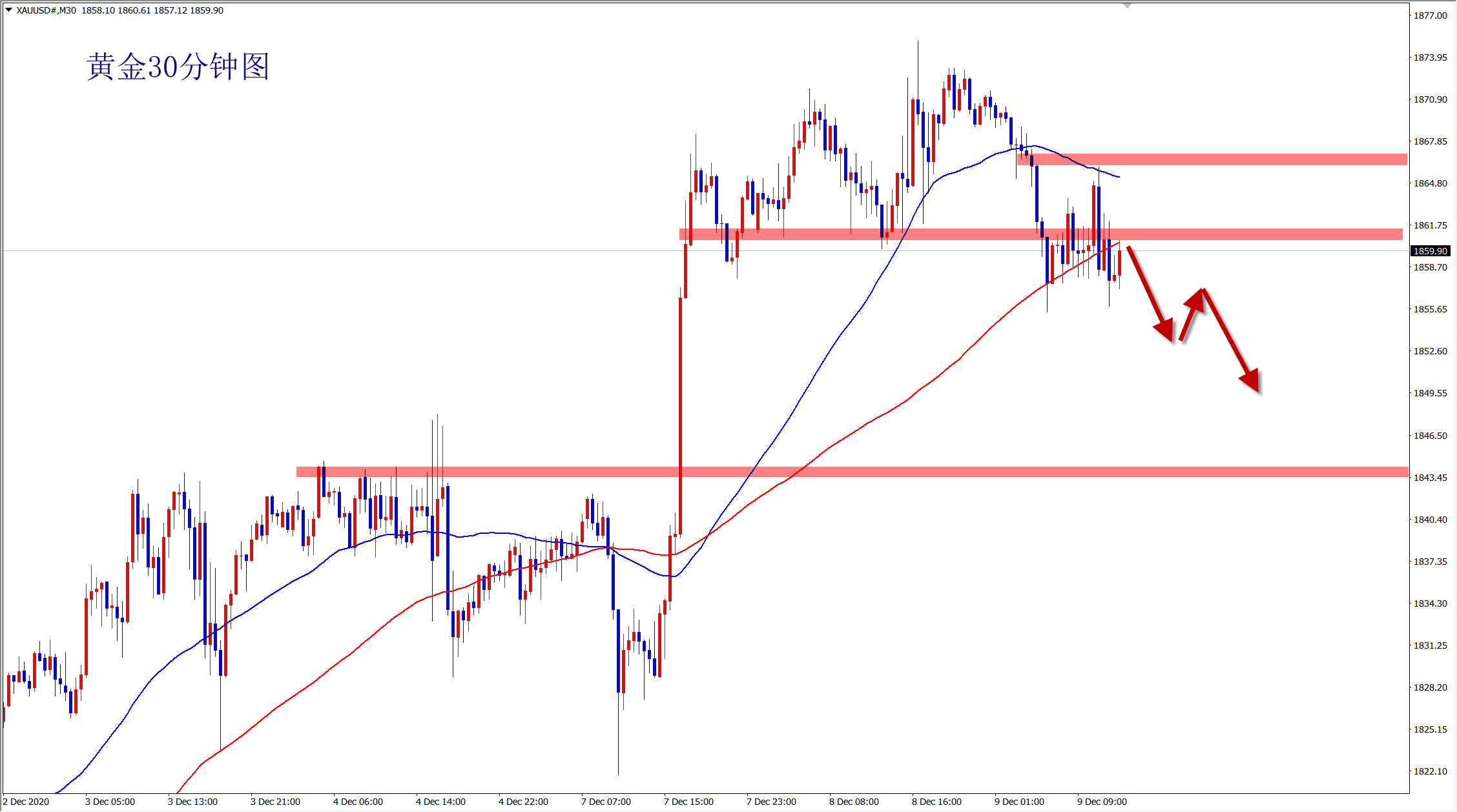 周三(12月9日)欧市交易时段,市场风险情绪仍偏正面,欧股多数反弹走高,令人振奋的疫苗研发进展激励投资人转战风险较高资产,全球股市涨至纪录高点。值此之际,避险黄金明显需求不佳,现货金日内一度失守1860美元,美国纾困计划能否推出对金价后市表现至关重要。另外,中美关系紧张以及美元走势也对黄金有一定的影响