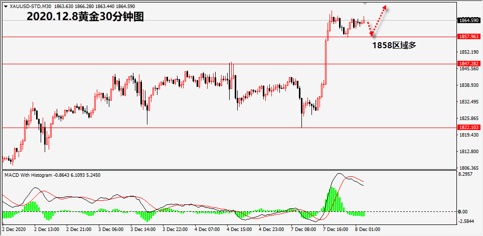 周二(12月8日)亚市早盘,现货黄金小幅上涨,现报1866美元/盎司附近。知名财经网站cooi.co最新撰文,对金价后市走势进行分析。 由于市场预期美国将出台新的财政刺激措施,周一黄金价格大幅上涨。现货黄金收报1862.27美元/盎司,上涨23.56美元或1.28%,盘中最高触及1868.51美元/盎司。 cooi.co