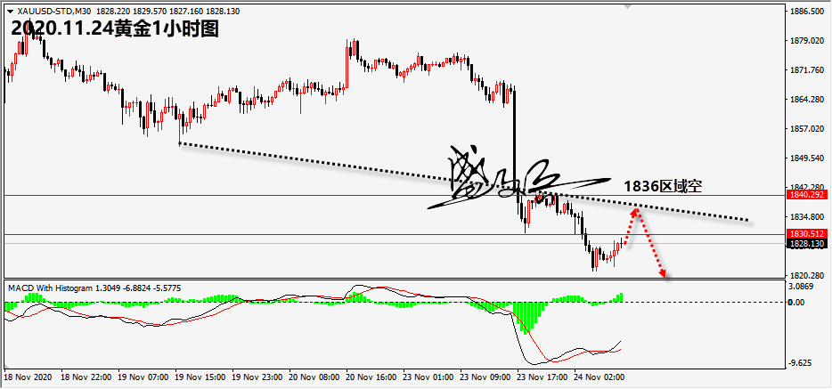 利空因素导致大跌,技术性破位打开区间!昨日市场受到疫苗的乐观消息影响及美国商业活动数据的强劲增长等多重打压,金价盘中自1870美元上方承压,下破位1850美元支撑后继续扩展,隔夜最低触及1835美元,反弹后也未能收高,最终价收低。 今早间空头延续走跌,截止到目前再触低1821美元,整体的趋弱态势十分明显