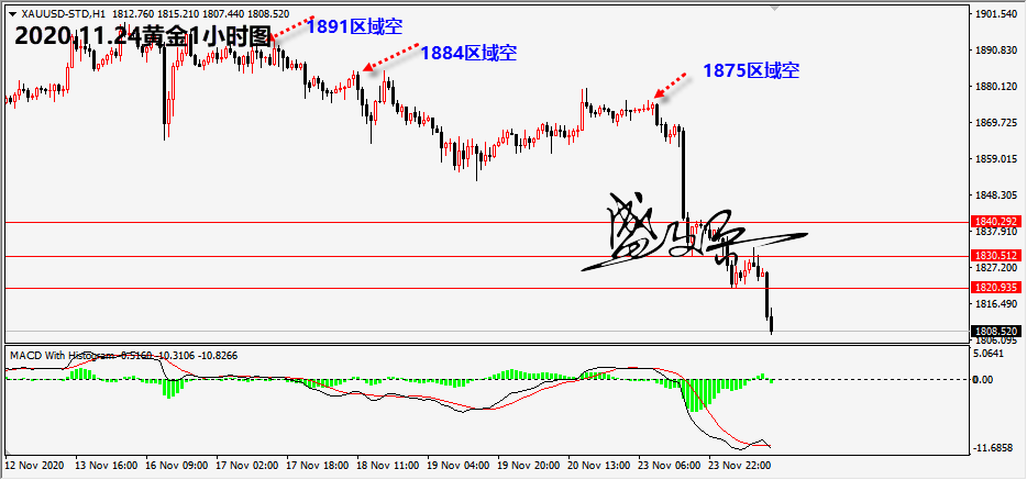 黄金 疫苗消息和美国经济扩张继续在市场发酵,黄金在欧盘继续延续弱势下跌。晚盘重点关注美国经济数据以及美股走势对黄金的影响。 黄金完全符合笔者的预期,上周笔者提示在1891和1884区域参与中线的空头,周一继续在1875区域布局中线空头。黄金在隔夜跌破1850后今日持续的走低。目前