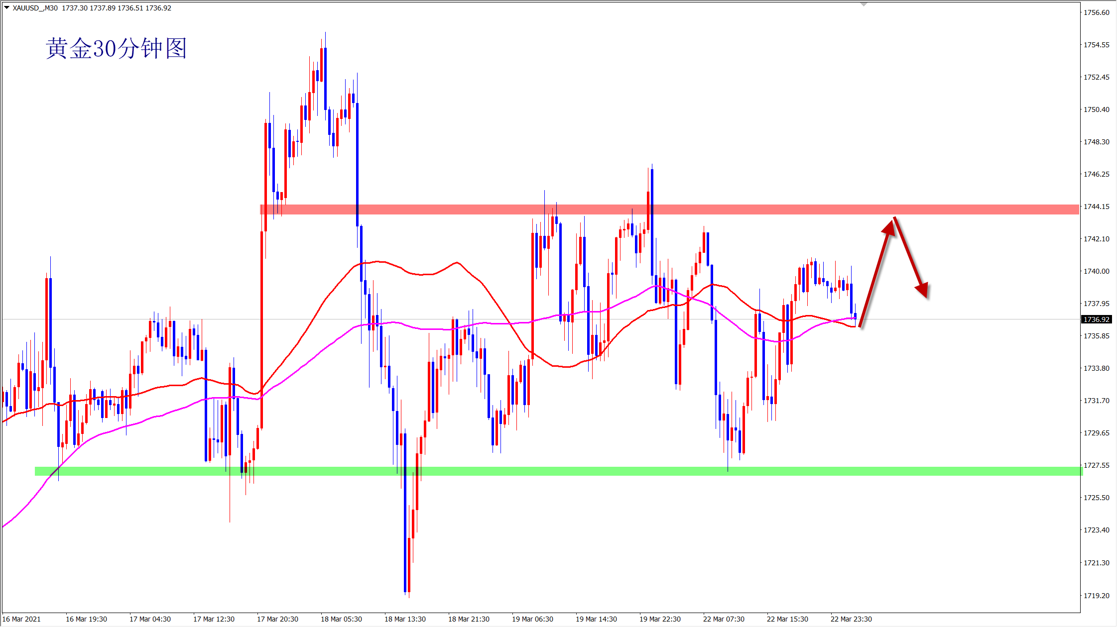 昨日鲍威尔表示复苏快于预期,经济增长势头将要增强,拜登总统将要推出3万亿美元的基建计划,旨在提振美国经济,并且声明美联储仍会提供支持,受这些消息面的影响,昨日美元的走势上冲无力,技术面走势依然还是维持震荡 目前黄金技术面短期的走势依然还是一个偏向小幅度的多头反弹上涨走势,目前技术面短期黄金维持在