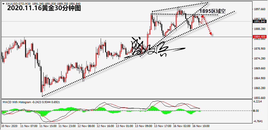 持稳低位,整固反弹,势能匮乏,承压再跌!近两日金价维持在1860美元上方整理运行,反弹未能触及1890美元,波幅区间愈发减小,今日盘截止到目前始终维持在1880美元下方整固,看似略显强势,实际上涨却无力。 自周初盘大跌破位后,金价支撑于1850美元上方整理到现在,疫苗的利好情绪基本释放完毕,然贸易局势及