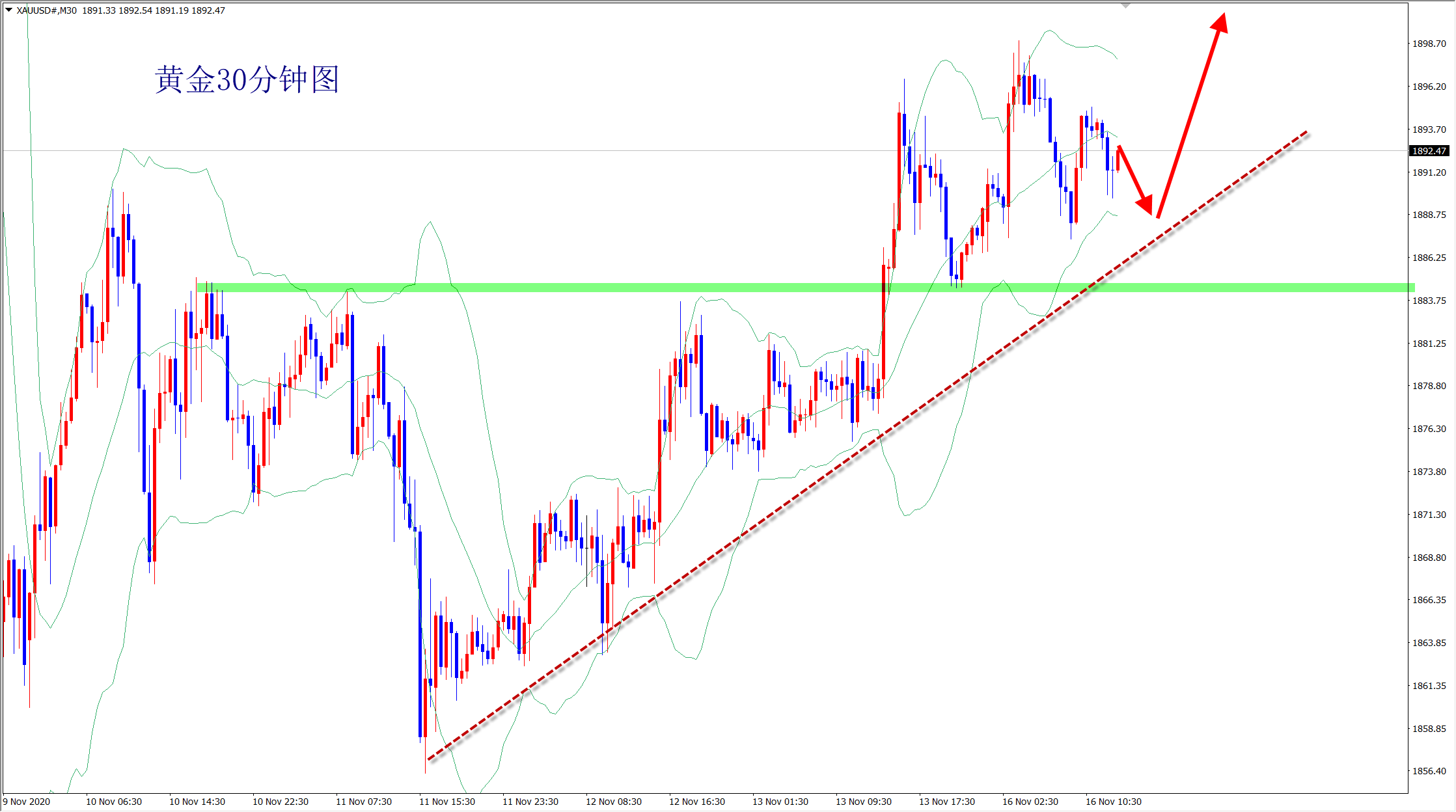 11月第二周黄金先跌后涨,在国际局势不稳的情况下,有单日大跌110美金的行情,也有周四周五连续反弹的力度,最终收盘在1888附近,技术走势上,1850区域终归是守住了,短期已经不具备继续下跌的条件了,行情进入震荡周期。基本面上,还是美国大选的混乱局面余温未了,美国新旧总统权力交接期以及川普支持者大规模集会