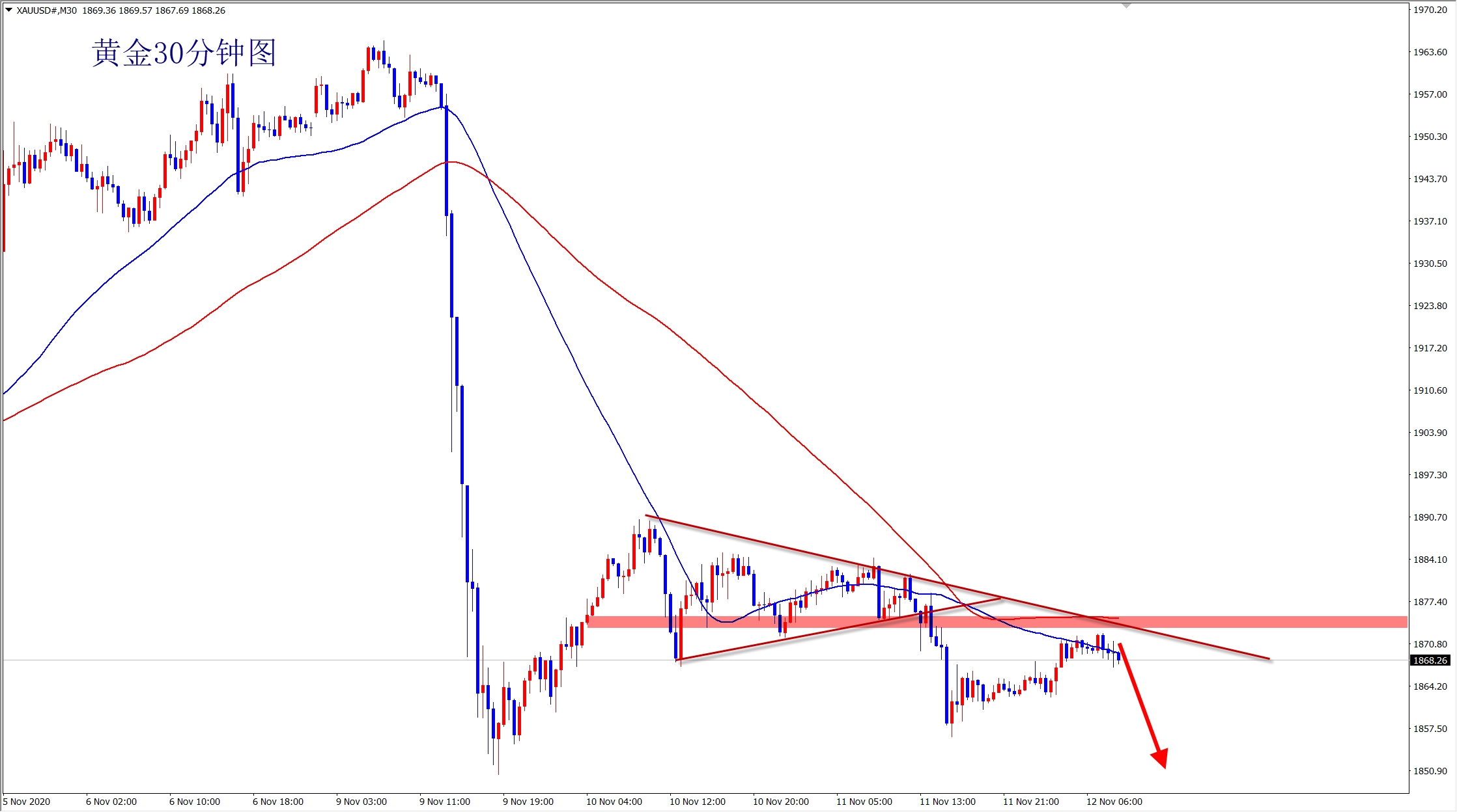 黄金日内震荡反弹,多头虚张声势,走了一天最终也没有突破1875的阻力,多头非常弱势,行情波动不大,我们还是维持此前的策略不变,1875下就是空! 黄金现在的走势非常简单,无非是大跌后的震荡修正,但是震荡也有强有弱,而现在的行情则是非常弱势,因为反弹遇阻1890后便一路走低,高点依次降低,今日的阻力就