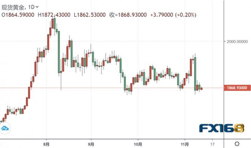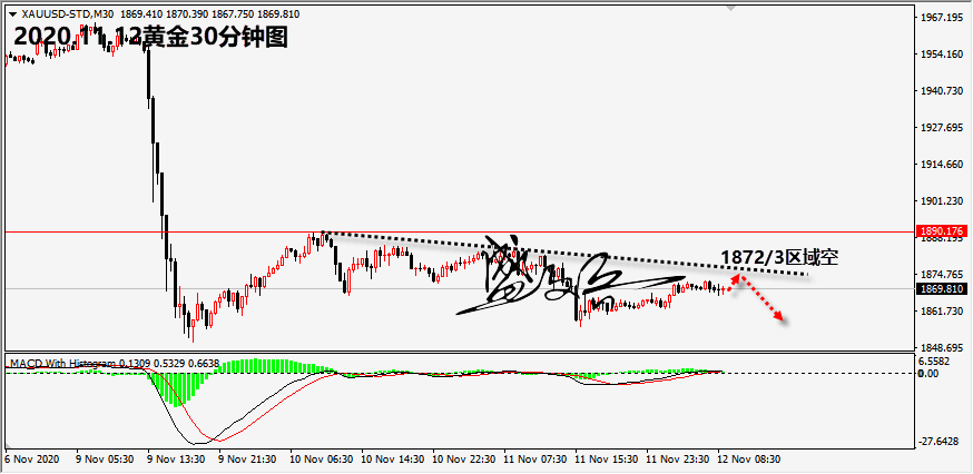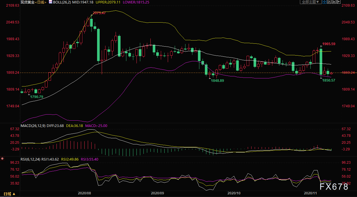 弱势下行,破位1860,走势处在预期,时间换取空间!昨日盘黄金价自1880美元上方承压走跌,盘中有效下破位1860美元支撑后延伸至最低的1856美元,随后有所反弹,最终价收于1865美元附近,今早间截止到目前价格触高1872美元。 疫苗所带来的利好情绪导致黄金空头放量大跌,一日内跌幅高达百点之多,毫无疑问也是过