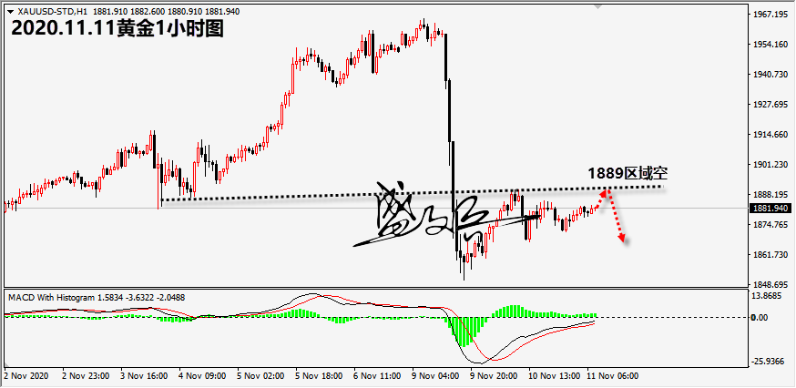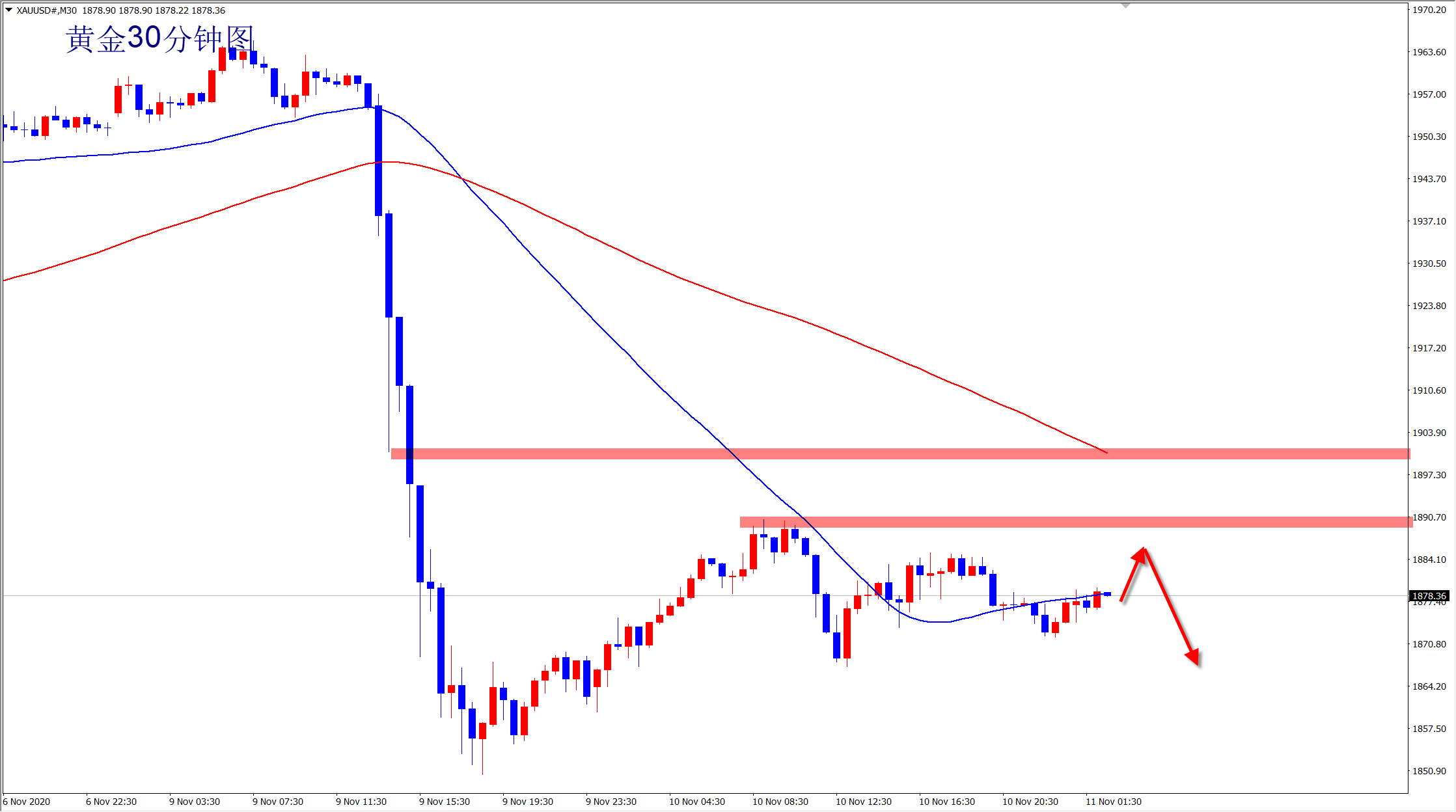 黄金 疫苗进展兴奋情绪开始消退,黄金在大跌100余美元之后,开始进入修正之中。本周接下来需要留意英国与欧盟脱欧最后一周的脱欧谈判。 笔者周一在1960提示参与空头,周二在1888提示参与空头,连续两波的空头已经成功获利130美元。 黄金在周一大跌后,周二开始价格进入修正跌幅中。日图一根