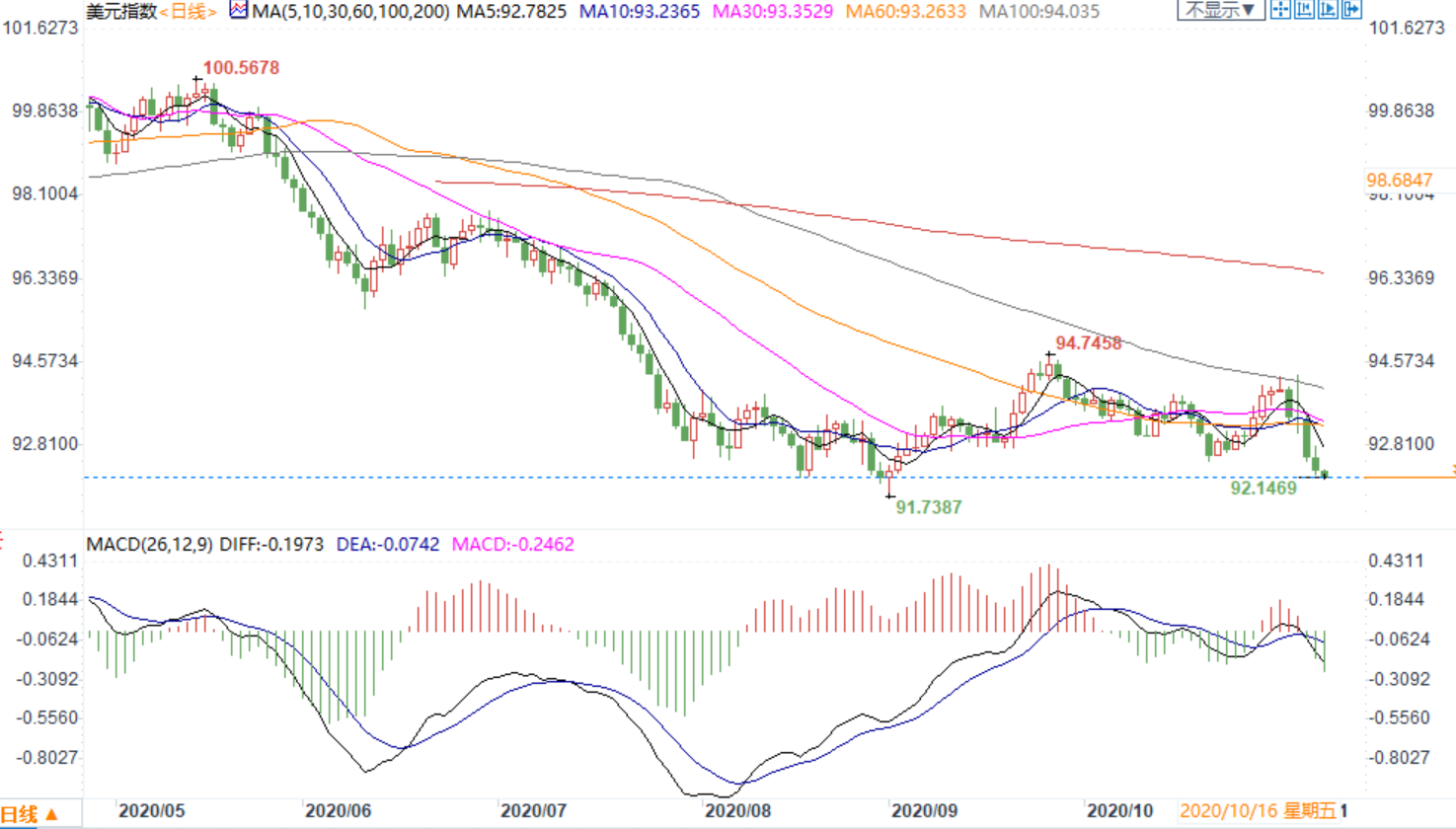 周一(11月9日)亚洲时段,美元兑一篮子货币跌至逾两个月最低,美国总统大选的计票工作仍在进行,预计国会两院仍将分别由两党掌控,投资者预测美元将进一步下跌。拜登当选美国总统,呼吁国人弥合分歧,承诺迅速采取抗疫行动,并实现有序权力交接。而特朗普仍拒绝承认败选,其竞选团队提起一系列诉讼和重新计票要求,但