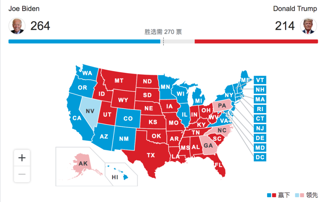 从福克斯新闻、美联社以及国会山报等美国媒体的消息来看,美国民主党候选人目前已经拿到264票,距离270票仅有一步之遥;c等媒体的美国大选地图显示,拜登目前为253票…… C和英国卫报表示,目前拜登尚未拿下亚利桑那州,但他在该州仍领先特朗普。“福克斯新闻和美联社的结论‘为时尚早’。”卫报当地时间4