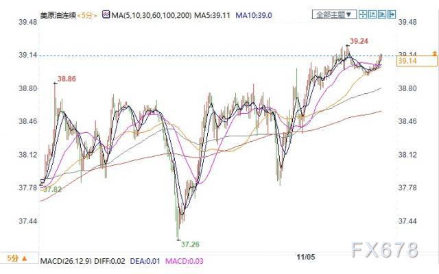 周四(11月05日)亚洲时间段,美原油小幅下行,现报38.67美元/桶,跌幅1.23%,美原油连续3日上涨,总体涨幅近10%,因拜登已经扭转不利局面,市场预期拜登会支持更大规模的财政刺激,这有利于美国经济的需求,对原油形成了上涨预期。美国能源信息署公布的美国原油库存数据降幅远超预期,说明美国对原油短期需求强劲。